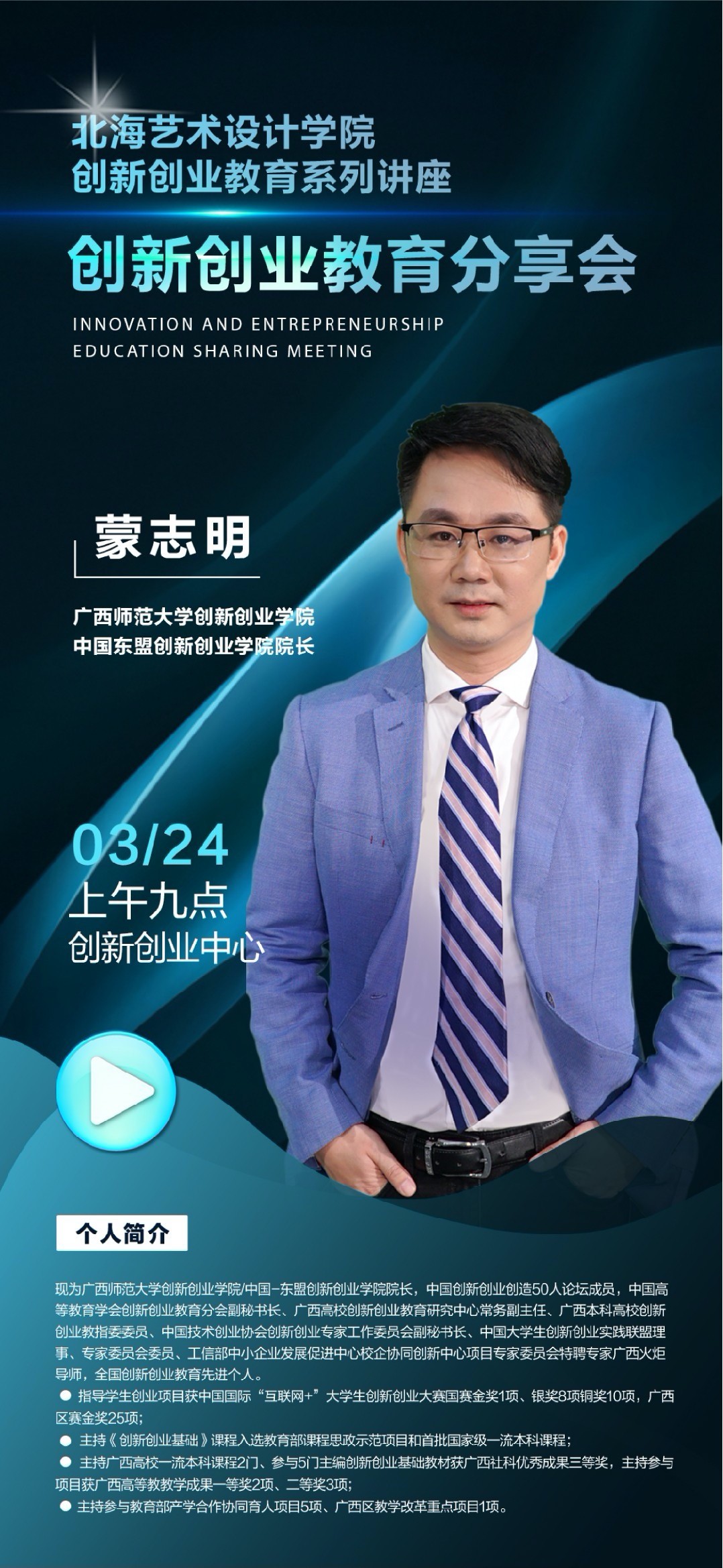 华东师范大学在读博士,硕士生导师。现为广西师范大学创新创业学院/中国-东盟创新创业学院院长,中国创新创业创造50人论坛成员,中国高等教育学会创新创业教育分会副秘书长、广西高校创新创业教育研究中心常务副主任、广西本科高校创新创业教指委委员、中国技术创业协会创新创业专家工作委员会副秘书长、中国大学生创新创业实践联盟理事、专家委员会委员、工信部中小企业发展促进中心校企协同创新中心项目专家委员会特聘专家、广西火炬导师,全国创新创业教育先进个人。指导学生创业项目获中国国际“互联网+”大学生创新创业大赛国赛金奖1项、银奖8项、铜奖10项,广西区赛金奖25项;主持《创新创业基础》课程入选教育部课程思政示范项目和首批国家级一流本科课程,主持广西高校一流本科课程2门、参与5门;主编创新创业基础教材获广西社科优秀成果三等奖,主持参与项目获广西高等教育教学成果一等奖2项、二等奖3项;主持参与教育部产学合作协同育人项目5项、广西区教学改革重点项目1项。