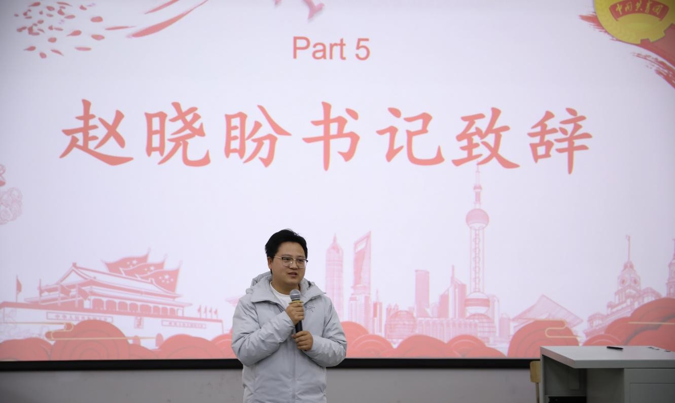 随后,赵晓盼书记发表致辞。他首先对本学期分团委学生会全体成员的辛勤付出与亮眼成绩给予充分肯定,强调各部门在校园文化建设、志愿服务开展等方面,有效搭建了学院与学生沟通的桥梁。同时,他鼓励大家在今后工作中既要立足本职、精益求精,也要勇于突破、大胆尝试。最后,他寄语全体成员珍惜平台、锤炼本领,在服务同学、奉献校园的过程中实现自我成长。大会在全体成员齐唱校歌的庄重氛围中走向尾声,之后大家移步指定位置合影留念,为本次总结大会画上圆满句号。