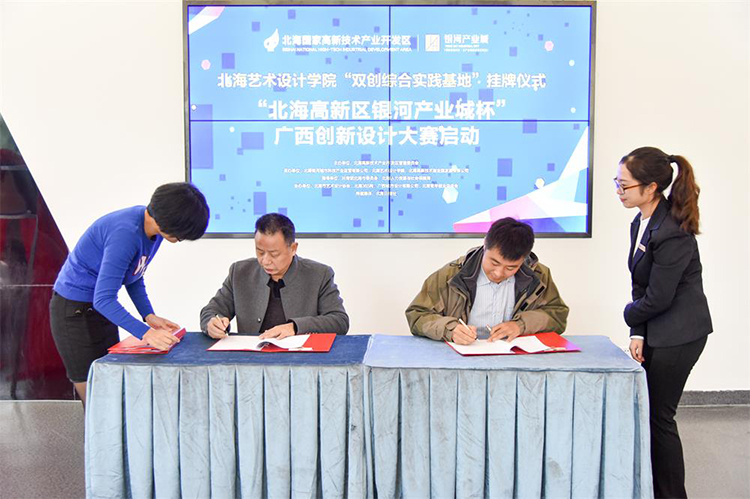 令人激动隆重签约仪式正式开始。首先是北海高新区和我院代表签约。紧接着是银河产业城和我院环境艺术学院代表签约。