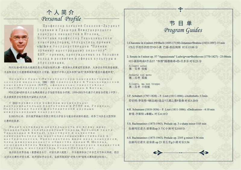 此次音乐会阿列克谢•索科洛夫教授共带来六首作品,作品跨越了西方音乐史上巴洛克、古典主义、浪漫主义三个最重要的音乐时期,涉及多种不同的钢琴体裁。音乐会一开场,阿列克谢•索科洛夫教授演奏了改编自巴赫的左手技巧性练习曲以及出自乐圣贝多芬之手的高难度钢琴奏鸣曲,两首曲目演奏时间长达30分钟,让现场听众共同领略了钢琴家高超的演奏技巧和对大型作品强大的驾驭能力。紧接着,阿列克谢•索科洛夫教授带来两首改编自艺术歌曲的钢琴乐曲,指尖在琴键上飞舞,流淌出细腻、柔美的音符将艺术歌曲的歌唱性及歌词意境表现得淋漓尽致。音乐会的最后两首作品是俄国最具代表性的爱国钢琴家拉赫马尼洛夫的前奏曲,拉赫马尼洛夫的24首前奏曲是他共耗时18年且将自身一生缩影融入其中的宏伟之作,从阿列克谢•索科洛夫教授生动的演奏中,现场师生切身感受到了作品苍凉、深沉而独特的俄式音乐风格。