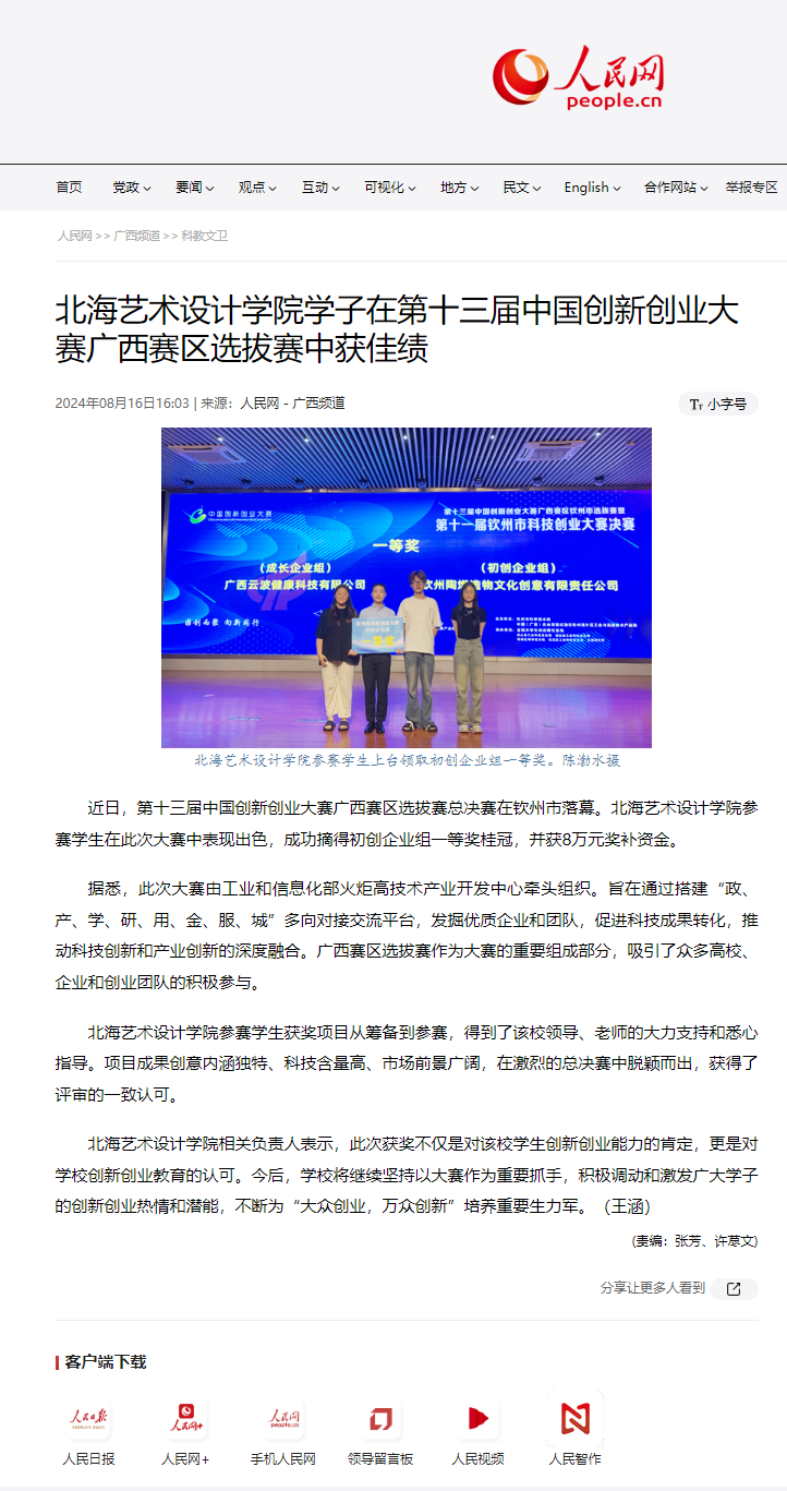 人民网:北海艺术设计学院学子在第十三届中国创新创业大赛广西赛区选拔赛中获佳绩