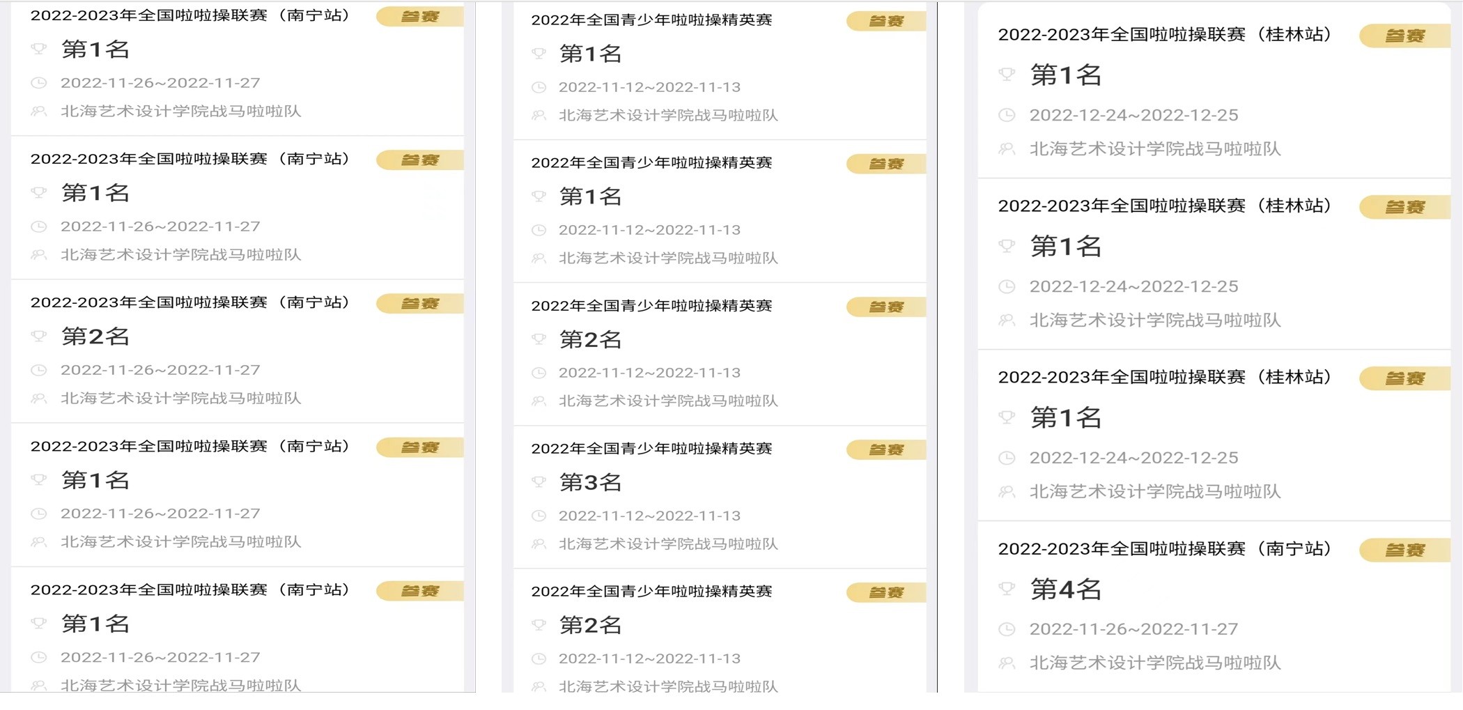 在2022年11月的“2022年全国青少年啦啦操精英赛”取得2项第一名、2项第二名、1项第三名;在11月的“2022-2023年全国啦啦操联赛(南宁站)”取得4项第一名、1项第二名、1项第四名;在12月的“2022-2023年全国啦啦操联赛(桂林站)”取得3项第一名的优异成绩!