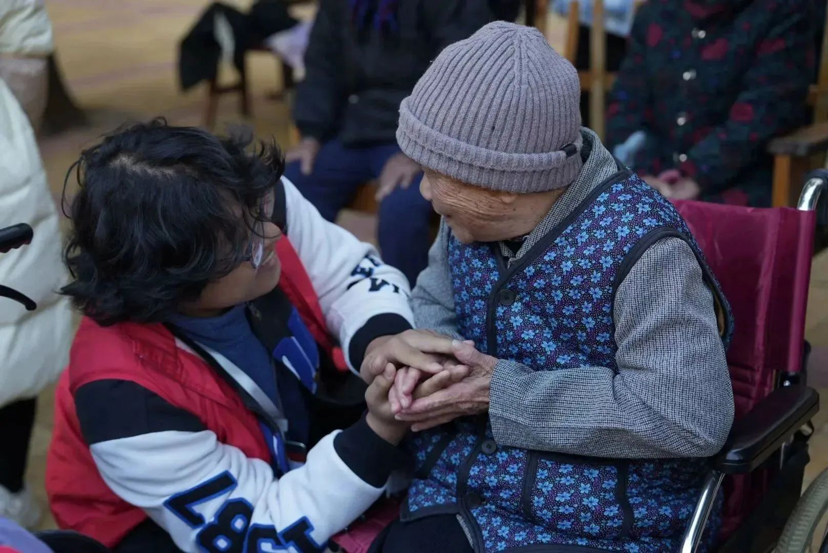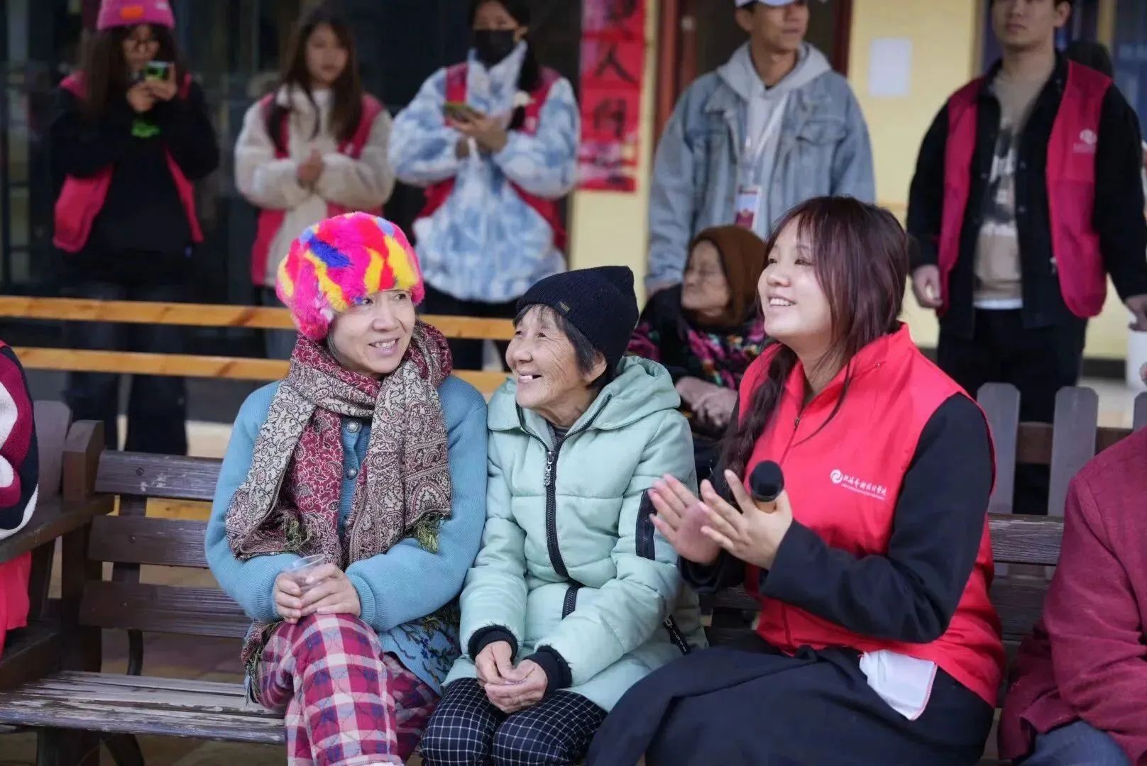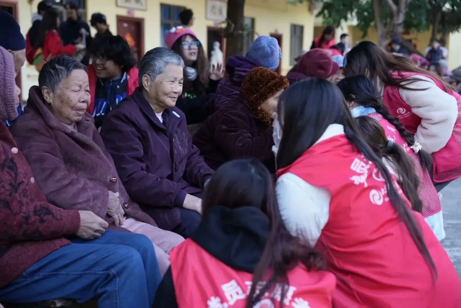 (志愿者与老人们交谈)