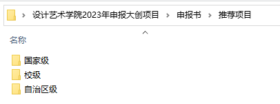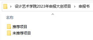 1.电子版:申报书(含两个文件夹,分别以“推荐项目/未推荐项目”命名)、项目一览表以上内容须置入1个文件夹内并压缩成1个Rar格式文件,文件夹命名:二级学院+2023年申报大创项目(例“设计艺术学院2023年申报大创项目”)。由各二级学院汇总后于2023531前发送至邮箱:bhyscxcy@163.com不接收学生个人项目单独发到此邮箱)。二级学院文件夹压缩包层级如下: