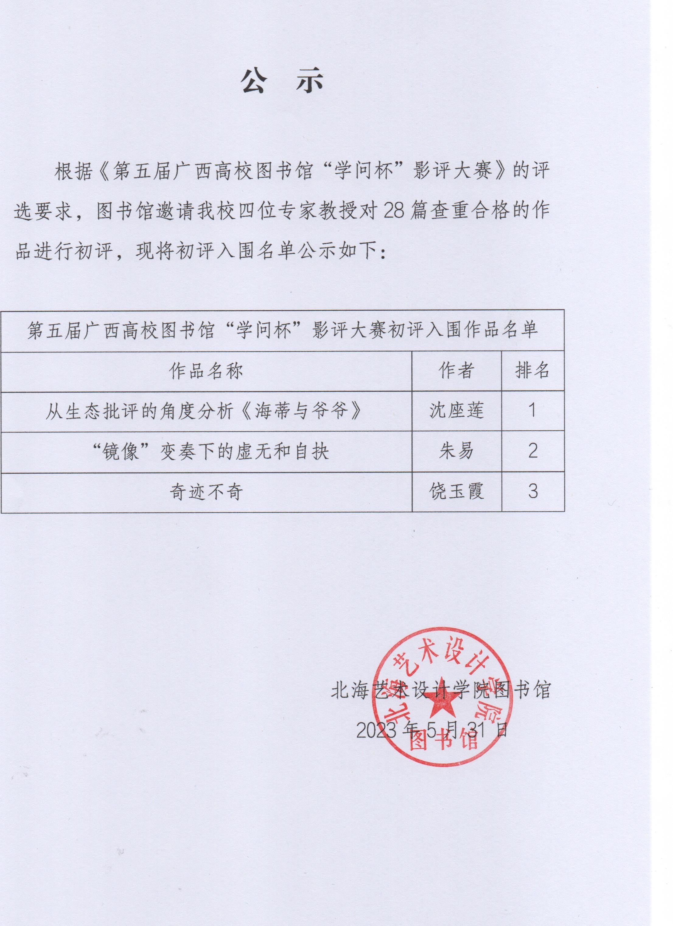 第五届广西高校图书馆“学问杯”影评大赛初评入围作品名单