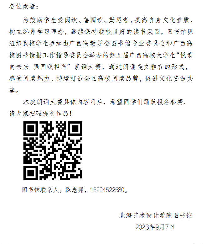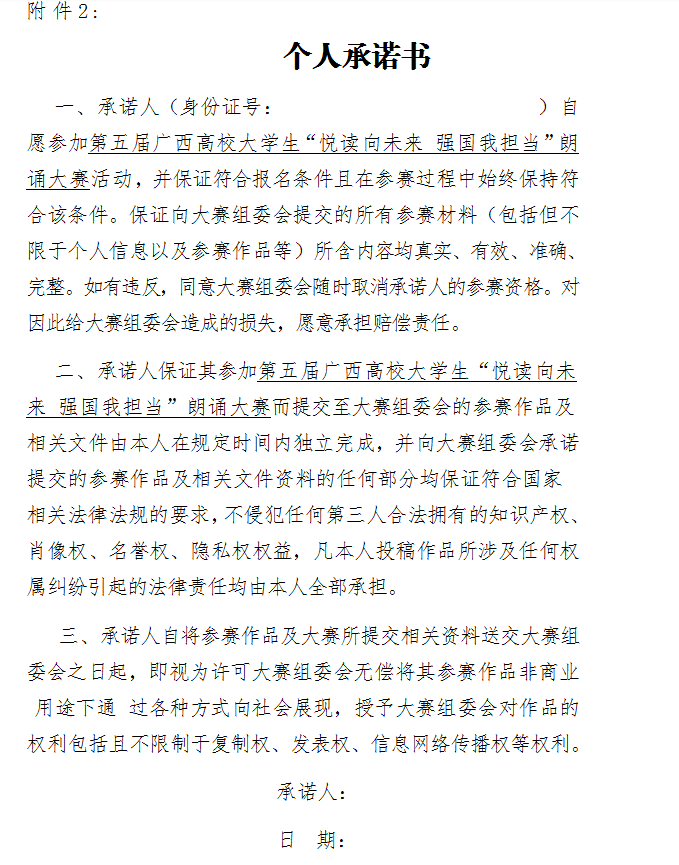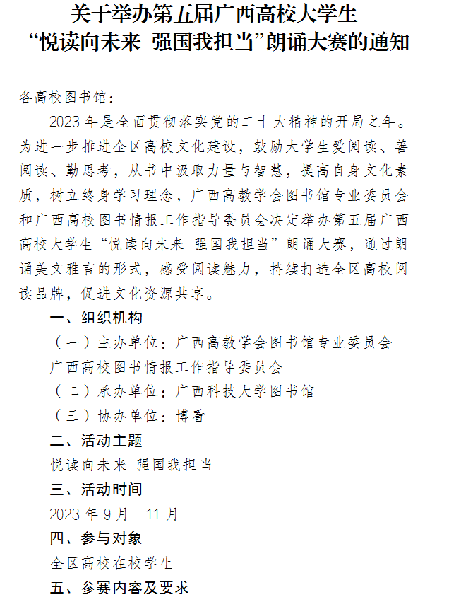 关于组织参加第五届广西高校大学生 “悦读向未来 强国我担当”朗诵大赛的通知