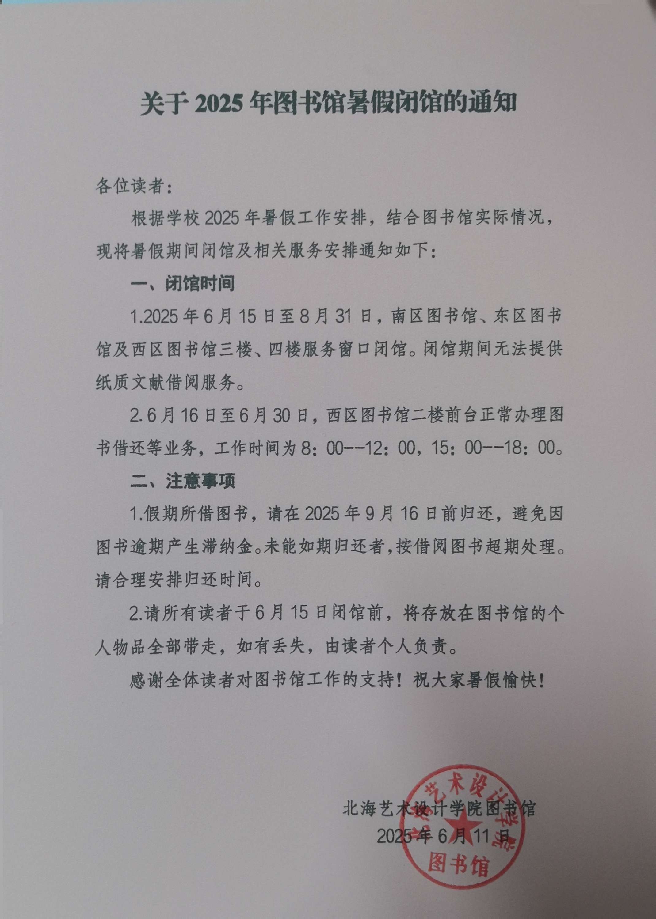 关于2025年图书馆暑假闭馆的通知