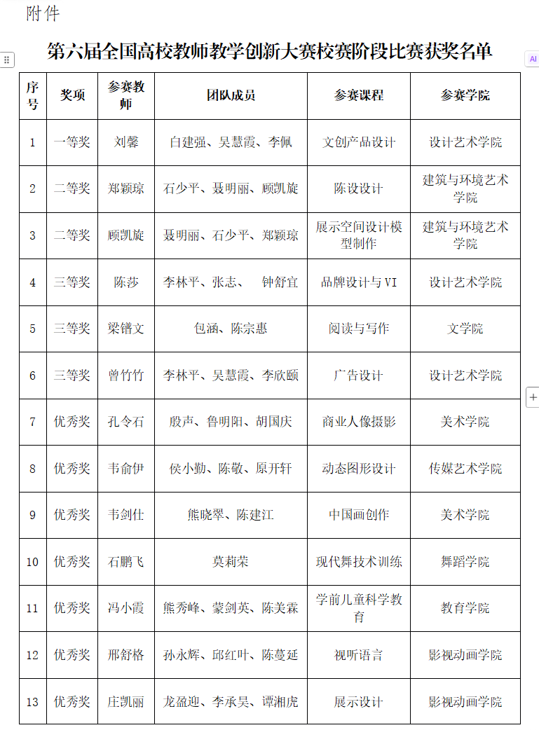 关于公布第六届全国高校教师教学创新大赛校赛阶段比赛获奖名单的通知