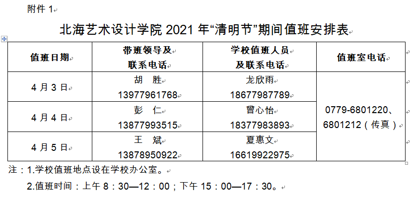 附件:北海艺术设计学院2021年“清明节”期间值班安排表