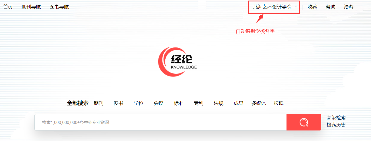 在校园网内打开经纶平台网址:http://k.vipslib.com/ ,系统会自动登录,右上角会有学校名称认证,如打开网址后提示要登录,请前往校园网环境使用。
