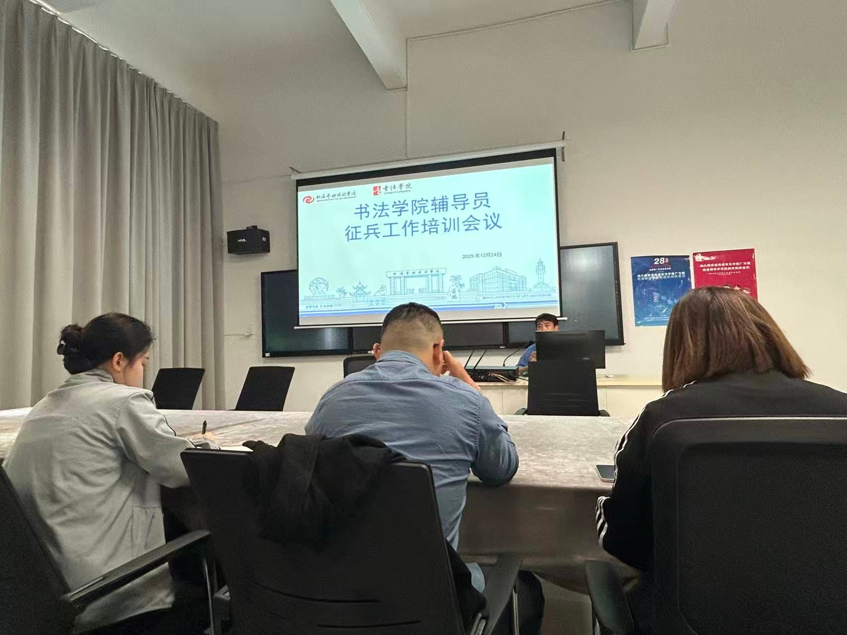 为贯彻落实国家征兵政策,推动学院征兵工作提质增效,1224午,书法学院学工办在艺德楼507会议室组织召开辅导员征兵工作培训会议。学院党支部书记喻广林、副书记左云飞,副院长李家琪、黄荣婷、韦志忍,学工办主任胡慧捷及全体学工教师、辅导员参加会议。