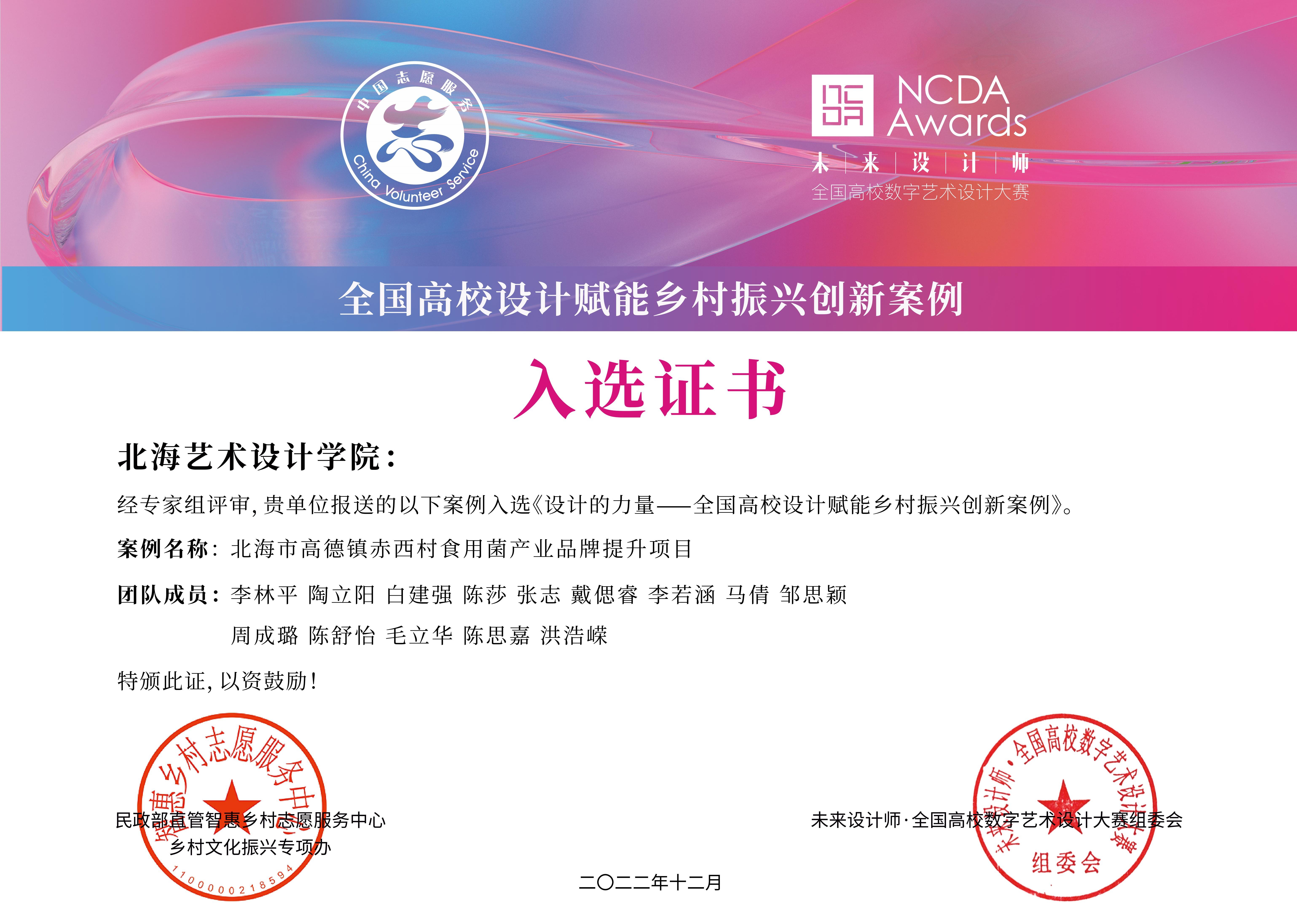服务地方,成绩凸出助发展。我校作为地方艺术院校,负有服务地方经济社会发展的职责,李林平老师就是教师中的典型代表之一,主持和参与的设计项目众多。如:2017年北海市创建全国文明城市标志、2019年北海市党群服务中心标志、2019年广西北海滨海国家湿地公园标志以及2020年北海智慧税务标志等,多件设计作品被政府、企业采用,助推了北海市城市服务水平的提升、美化了北海对外宣传的整体形象。特别是,2022年主持的北海市高德镇赤西村食用菌产业品牌提升项目,入选了“设计的力量——全国高校设计赋能乡村振兴创新案例”;2022年,负责的“合浦汉代文化博物馆文创项目”荣获学校服务地方突出贡献奖。