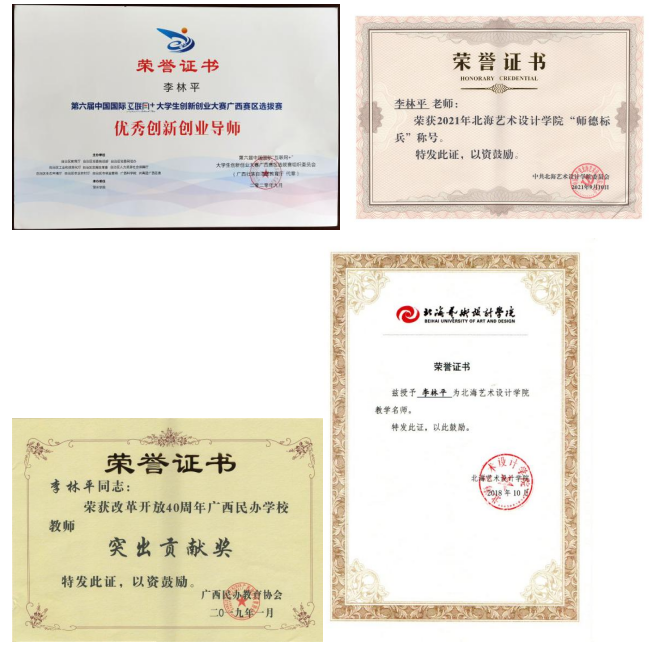 诲人不倦,潜心教学十八载。李林平老师无论处于教师职业生涯的任何阶段都秉持初心,奋战在一线。以教学为源点,不断更新育人理念和深耕教育规律,循序渐进、厚积薄发;以身为范,擅于引导学生成长,指导学生积极参与实践。他辅导学生参加的中国国际“互联网+”大学生创新创业大赛,各级赛事获奖共计10项:全国银奖1项、铜奖1项;广西赛区金奖2项、银奖2项、铜奖4项。辅导参加的全国大学生广告艺术大赛,各级获奖总计45项:全国二等奖4项、三等奖3项;广西赛区一等奖10项、二等奖5项、三等奖23项。李林平老师在教学、辅导上的优异表现,也收获了多项奖项或荣誉,如:中国国际“互联网+”大学生创新创业大赛广西赛区“优秀创新创业导师”、全国大学生广告艺术大赛“优秀指导教师”、时报金犊奖“优秀指导教师”、中国大学生广告艺术节学院奖“优秀指导教师”、改革开放40周年广西民办学校教师“突出贡献奖”以及北海艺术设计学院优秀教师、教学名师、师德标兵等。