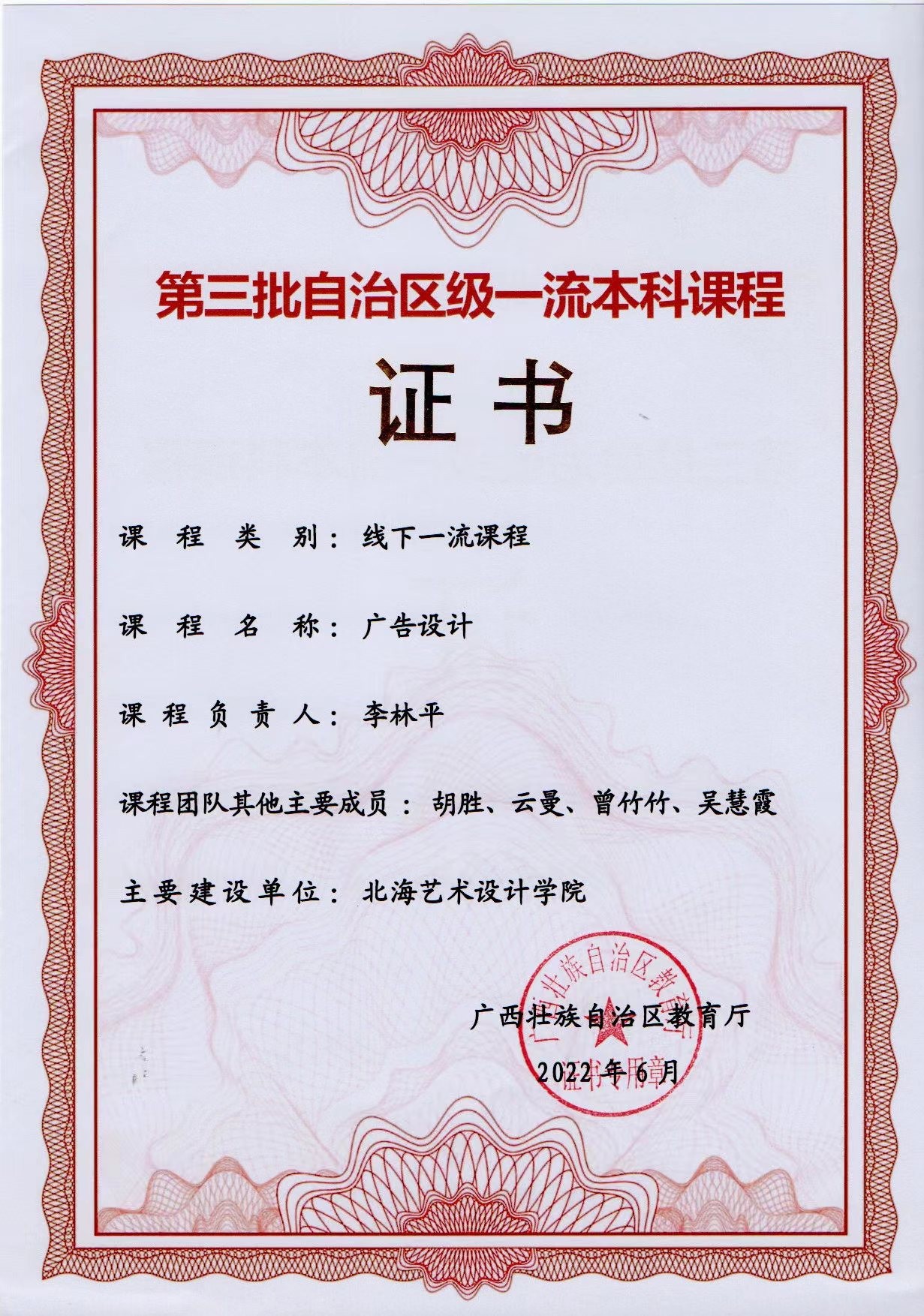 其中,2015年主持研究的广西高等教育本科教学改革工程项目《基于应用型人才培养的广告策划与设计课程研究与实践》,研究成果最为饱满,并且最优化应用于实际教学中。支撑了由李林平老师负责的《广告设计》课程,荣获了自治区级一流课程,为我校高质量课程的建设提供了成功的思路和榜样。同时,以该项目为基础,组织、申报的教学成果项目《对接文化创意行业的视觉传达专业创新型人才培养研究与实践》,获得了2019年校级一等奖。