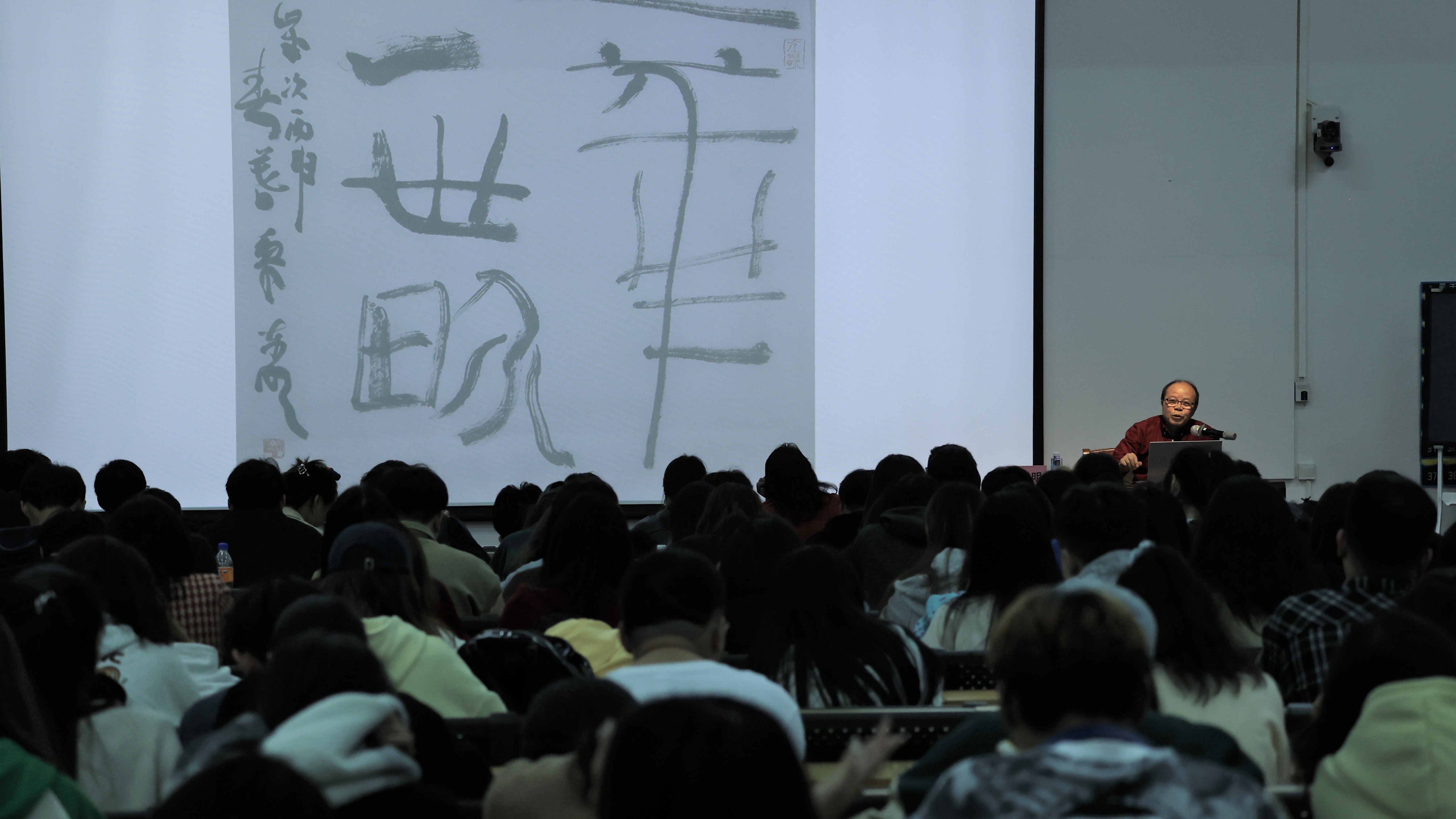 同时,黎东明教授结合个人书写经验与书法作品分享,为同学们展示笔画姿态对惯性用笔的空间解构,以不同作品的不同线条为例,深入对笔画内在信息量的解读,通过气息的内聚呈现线条的丰富程度。以线为基,将笔画走势与空间特征、笔画间距与空间节奏相互交映,对其中独立性与内敛凝聚进行剖析。