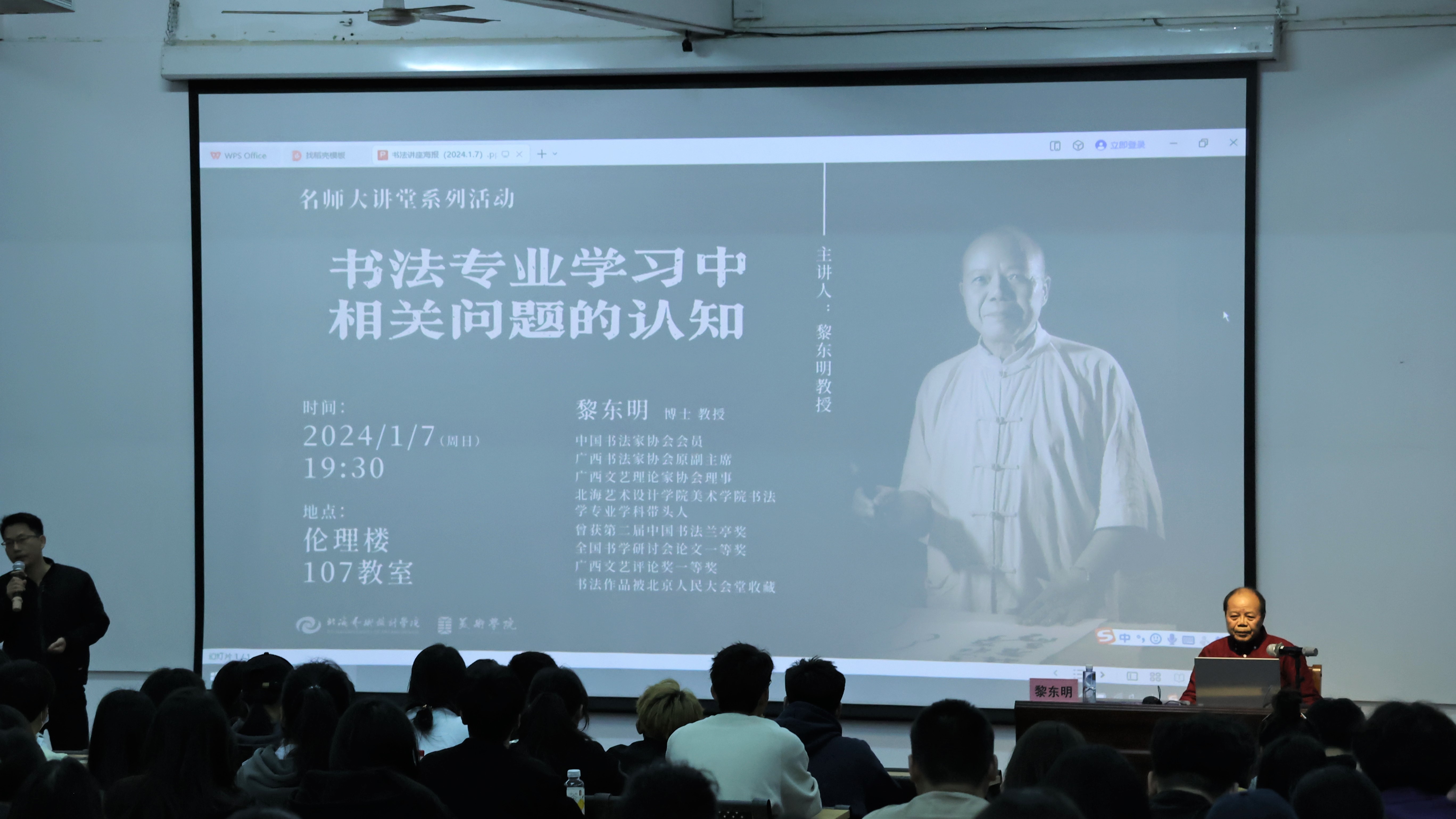 2023年1月7日晚7:30,黎东明教授于北海艺术设计学校西校区伦理楼107开展题为《书法专业学习中相关问题的认知》的讲座。本次讲座由书法学教研室主任苏乃从主持,美术学院2022、2023 级书法学专业师生参与。