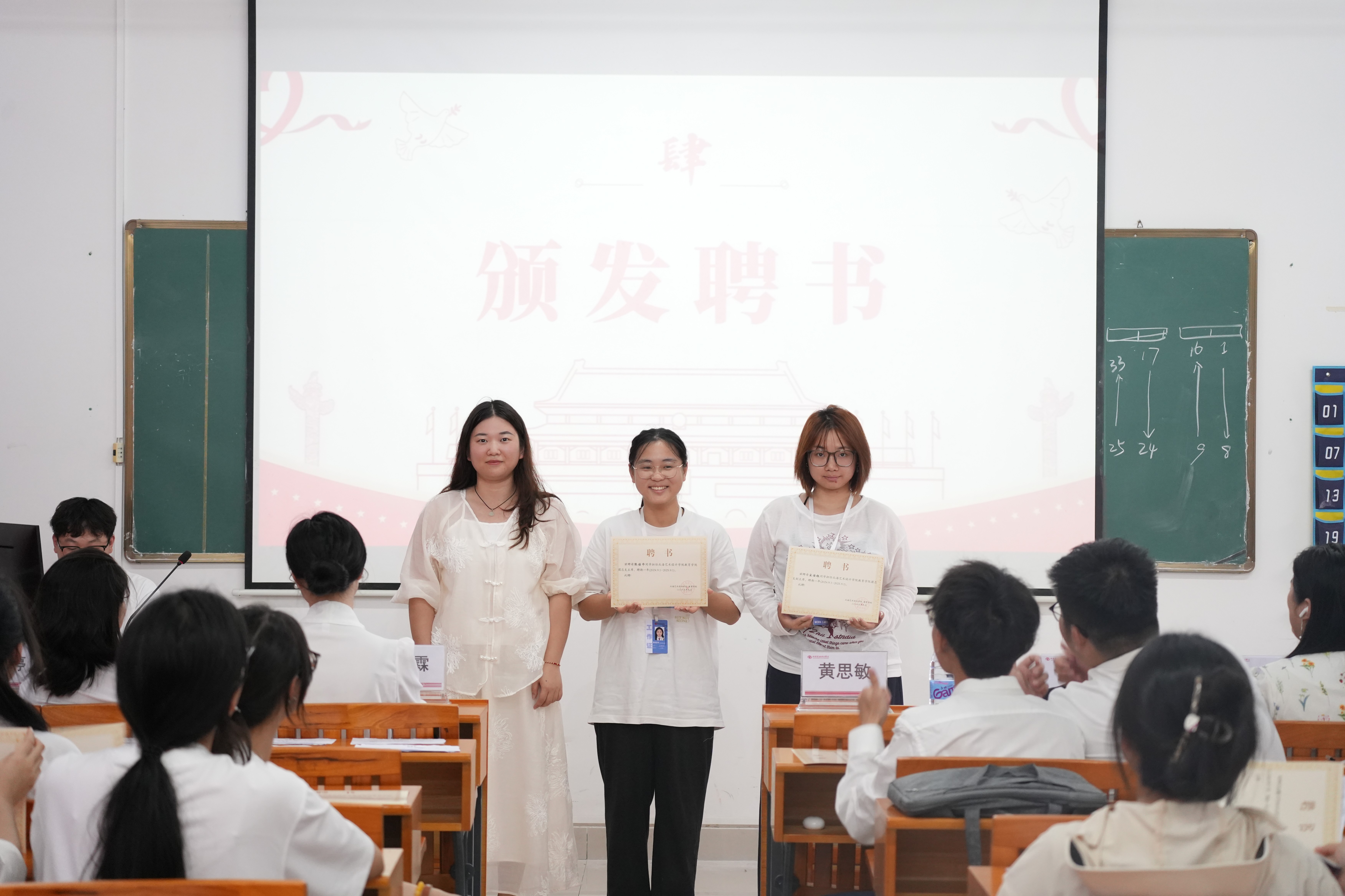 大会第项议程是为学生干部颁发聘书。各位教师代表为团总支干事颁发聘书指导老师陈美霖向表现优异的学生干部颁发2024-2025学年第二学期先进个人荣誉证书。一纸证书肯定其在本学期工作中的积极付出与出色表现,更承载着责任与信任,激励学生干部们在未来工作中继续践行初心,为团总支建设贡献力量。                                                                                教师代表给学生干部颁发聘书