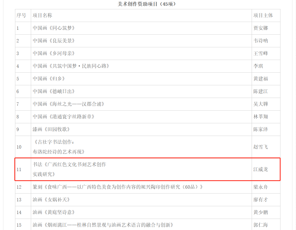 近日,广西艺术基金管理中心公布了《广西艺术基金(一般项目)2025年度资助项目名单》,书法学院江威龙老师荣获广西艺术基金美术创作资助项目(书法)资助。这是书法学院在艺术科研与创作领域的一次重大突破。