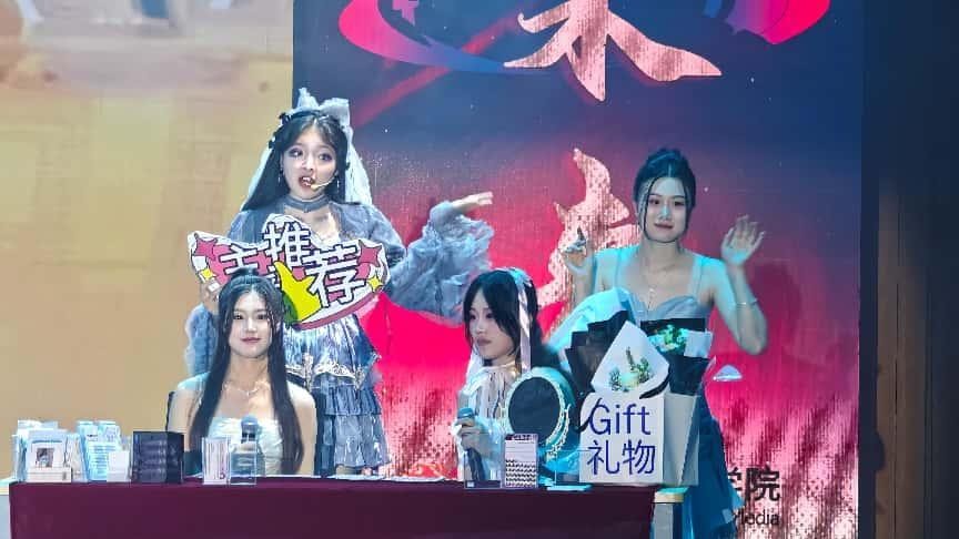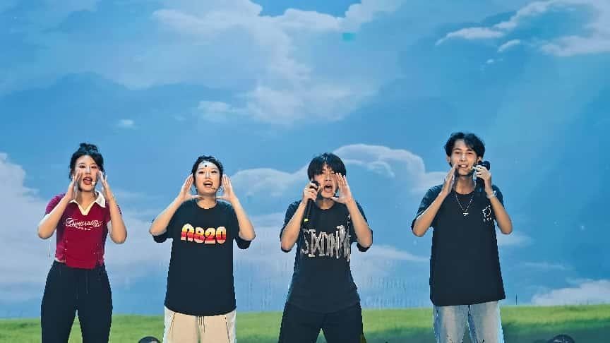 “声织星河・万象共情” 篇章情系当下,展望未来。模拟直播《买买买北艺直播间》紧跟时代潮流,同学们化身 “带货主播”,妙语连珠、互动感十足,生动展现新媒体语境下的传播新形态;朗诵《骑自行车的中国人》以质朴深情的声音,描绘平凡生活中的时代画卷,引发强烈共鸣;压轴的情景歌舞《声叙流年》将三年求学点滴融入歌声与表演,在温馨感人的氛围中诉说同窗情、师生谊和对未来的憧憬。
