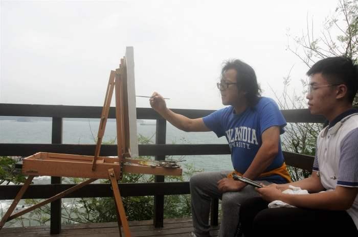 鳄鱼山公园是由火山喷发的熔岩所形成的天然景观,湛蓝的海水,赤红的火山岩礁石,再加上彰显岛屿风格的木头栈道,这一切新鲜的景象给师生们瞬间带来了无限的灵感,全体师生在大自然的鬼斧神工之下开始了对自己作品的构思并开始挥舞画笔。