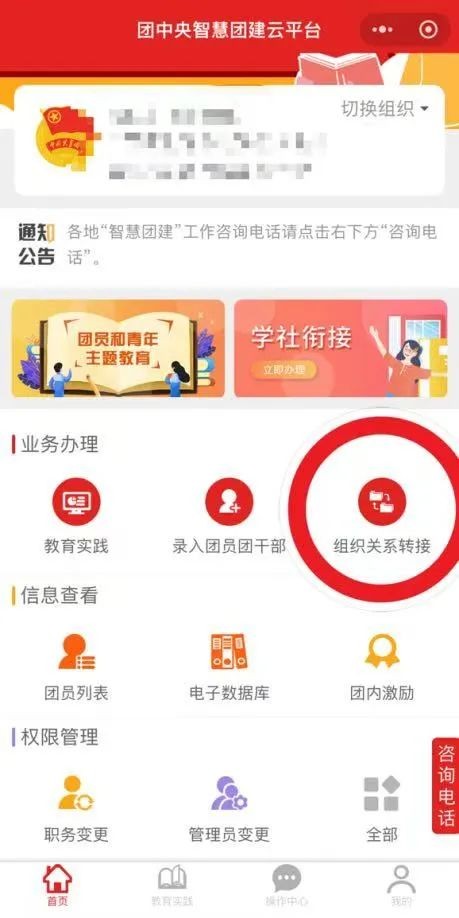 3.团员登录系统进入个人中心,点击中间“组织关系转接”菜单。