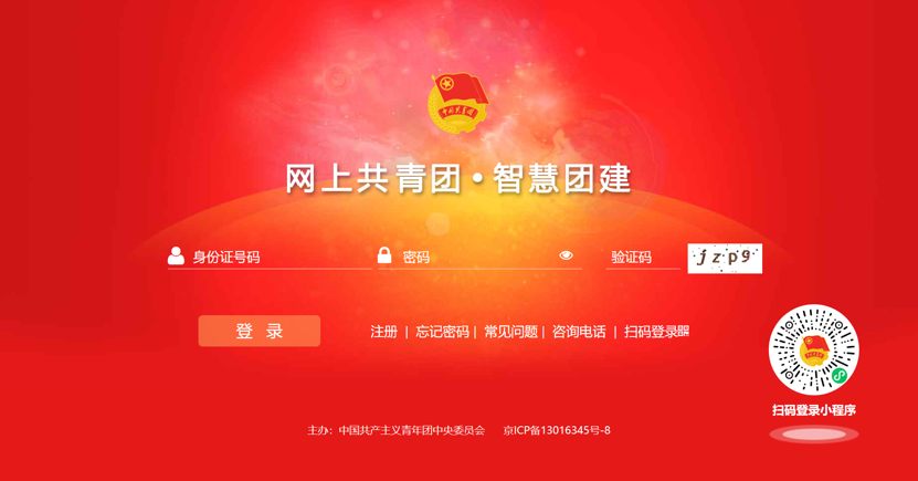 2.登录全国“智慧团建”系统,用户名为本人身份证号,初始密码为身份证后8位。如果忘记密码或密码错误,可以找本支部的管理员(一般为团支书)发放密码重置验证码,然后在登录页面点击忘记密码完成相关操作。