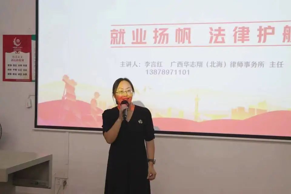 由广西华志翔(北海)律师事务所的李言红主任进行宣讲,李言红主任从在校期间社会实践权益保护、就业季如何签订三方协议、求职过程中如何避开陷阱和订立劳动合同过程中的注意事项四个方面切入。李主任首先为我们讲述了在校大学生勤工俭学不适用于劳动法这一情况以便能更好保护个人权益,接着讲述了在签订合同时,要仔细阅读合同条款,确保自己的权益不受侵害,并且就三方协议向我们提供了两点建议: