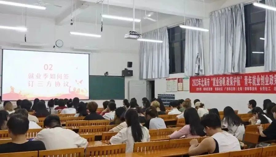 10月26日19:30,由团市委、银海区团委、青春社区、广西华志翔(北海)律师事务所、长青社区、北海艺术设计学院承办的2023年北海市“就业扬航,政策护航”青年就业创业政策宣讲活动在我校功德楼111开展。