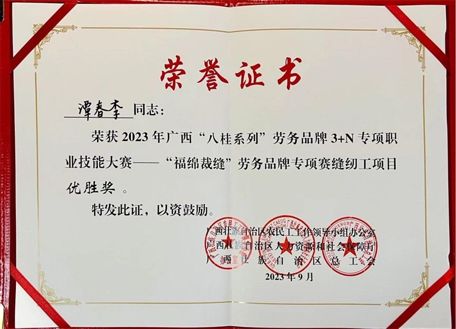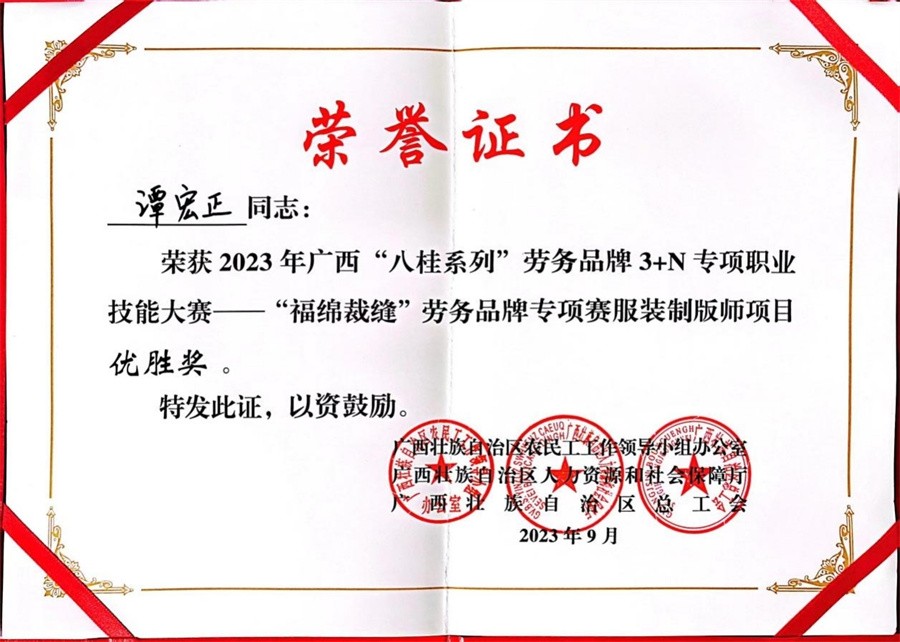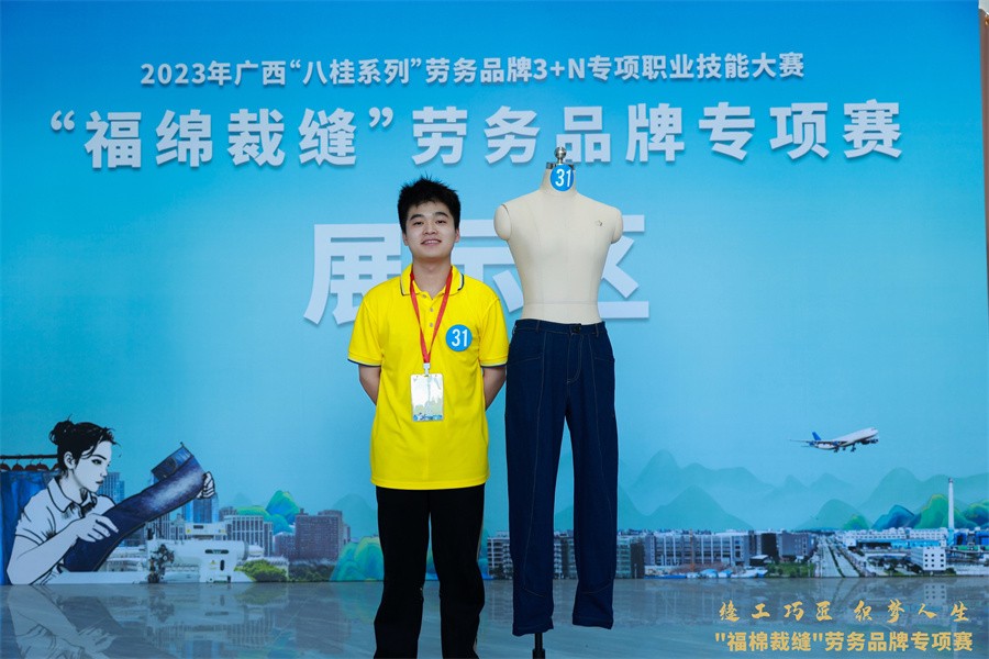 9月20日,由广西壮族自治区农民工工作领导小组办公室、广西壮族自治区人力资源和社会保障厅、广西壮族自治区总工会联合主办,玉林市人力资源和社会保障局、玉林市总工会、中共玉林市福绵区委员会、玉林市福绵区人民政府承办,玉林市福绵区人力资源和社会保障局、玉林市福绵区总工会、玉林市福绵区委人才工作领导小组办公室协办的2023年广西“八桂系列”劳务品牌3+N专项职业技能大赛——“福绵裁缝”劳务品牌专项赛在福绵国际牛仔电商轻纺城顺利举行。经过选手的激烈角逐,裁判组严格认真的评审,我校教师谭宏正获得服装制版师优胜奖,学生谭春李获得缝纫工优胜奖。