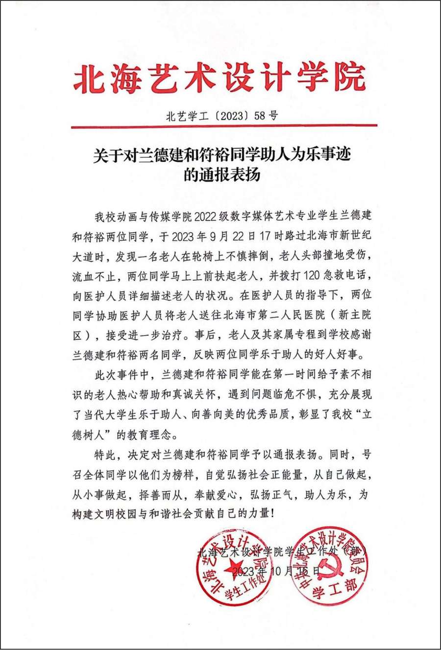 为此,学校学工处也对兰德建和符裕同学进行了通报表扬。