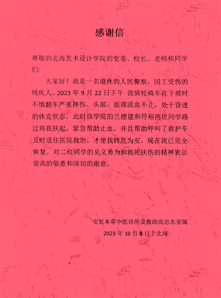 9月22日下午,在北海市沿海区新世纪大道辅路与西藏路交叉口附近,高忠东老人坐轮椅出行时不慎被障碍物绊倒,头部撞地受伤,流血不止,身体难以动弹。当时,我校动画与传媒学院兰德建和符裕两位同学恰巧路过,他们立即跑到老人身边,小心将他扶起,并根据自身所学的急救知识,迅速对老人进行了简单的止血处理并询问确认其身体状况,帮助老人联系家属。在得知老人家属无法及时赶到的情况后,两位同学马上拨打120急救电话,并向医护人员详细描述老人受伤状况。在等待医护人员赶到的过程中,兰德建和符裕两位同学始终守护在老人身边,不断与其温和沟通交流,安抚老人情绪,同时将现场的血迹和止血用品进行了清洁整理。在医护人员的指导下,两位同学协助医护人员将老人送往北海市第二人民医院(新主院区),接受进一步治疗。在确认老人无大碍后,两位同学才悄悄地离开了医院。