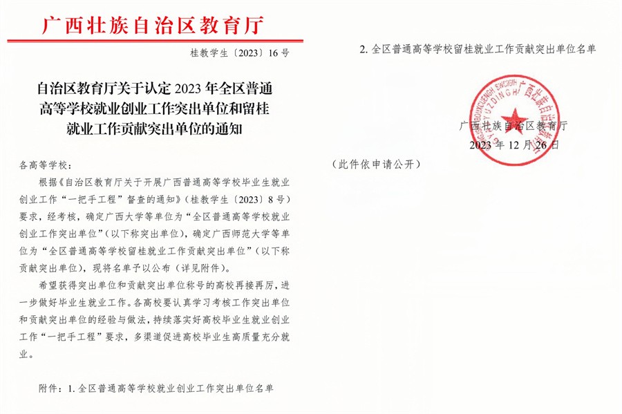 近日,根据自治区教育厅下发《关于认定2023年全区普通高等学校就业创业工作突出单位的通知》(桂教学生〔2023〕16号)文件,我校荣获“2023年全区普通高等学校就业创业工作突出单位”称号。这是我校第5年获得此项殊荣。