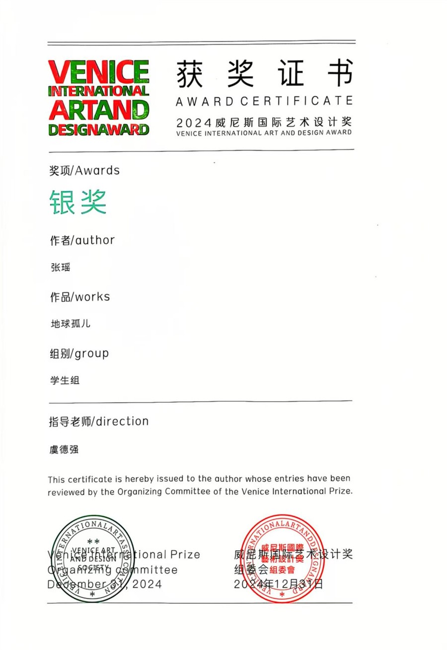 2024年12月31日,2024威尼斯国际艺术设计奖评选活动圆满落幕。我校动画与传媒学院学生张瑶的动画作品《地球孤儿》在此次大赛中脱颖而出,荣获银奖。
